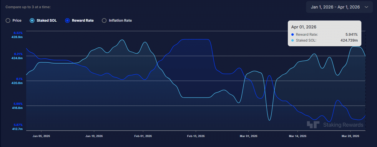Den Daten von Staking Rewards zufolge stiegen die eingesetzten SOL Ende Januar auf einen Quartalshöchstwert von 427,53 Millionen SOL. Allerdings sank die Nachfrage Anfang März um etwa 3 % auf einen Tiefststand von 414 Millionen SOL, bevor sie wieder anstieg.