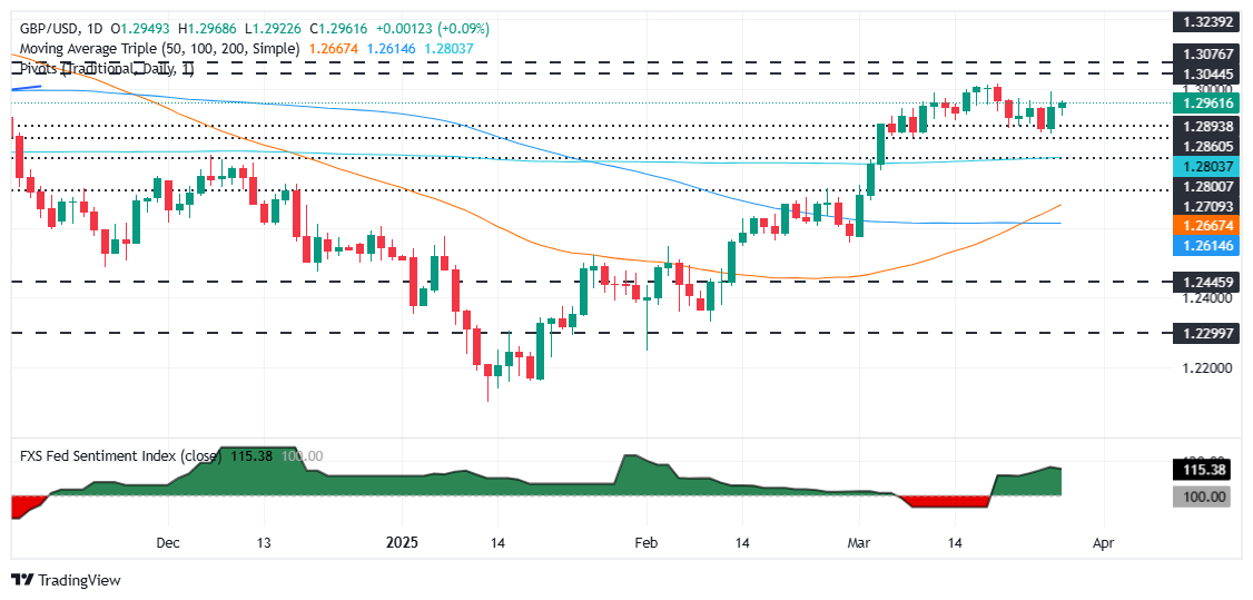 Das Pfund Sterling (GBP) bleibt fest und schwebt gegen 1,2950 gegenüber dem US -Dollar (USD), der praktisch unverändert ist, da die Händler den jüngsten Inflationsbericht der Vereinigten Staaten (US) unter Unsicherheit über eine potenzielle Handelskriegskalation nach der Einführung von Tarifen von Autos von Trump durch Trump durch Autos verdauen. Zum Zeitpunkt des Schreibens beträgt der GBP/USD -Wechselkurs 1,2948.