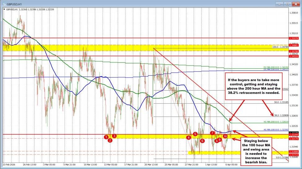 Der GBPUSD wird an diesem Tag höher gehandeltaber die Aufwärtsdynamik ist aufgrund einer wichtigen technischen Hürde ins Stocken geraten. Der hohe Preis testete das fallender gleitender 200-Stunden-Durchschnitt (nahe 1,3262)vorher kurz darüber stochern nach unten drehen– ein Zeichen dafür, dass Verkäufer dieses Niveau immer noch verteidigen.