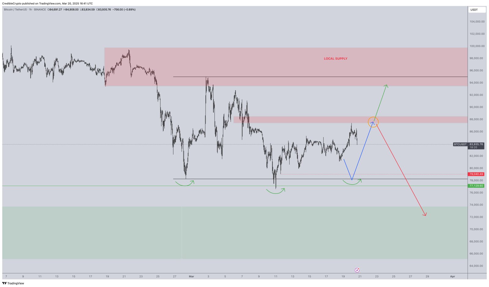 Wenn Sie die Versorgungszone nicht zurückerhalten, hat die Wahrscheinlichkeit eines Rückgangs in Richtung niedrigerer Unterstützungsstufen bis März um rund 77.000 bis 79.000 US-Dollar (in Grün hervorgehoben) erhöht. Das Testen dieses Gebiets als Unterstützung hat im März zu starken Preisaufprall geführt.
