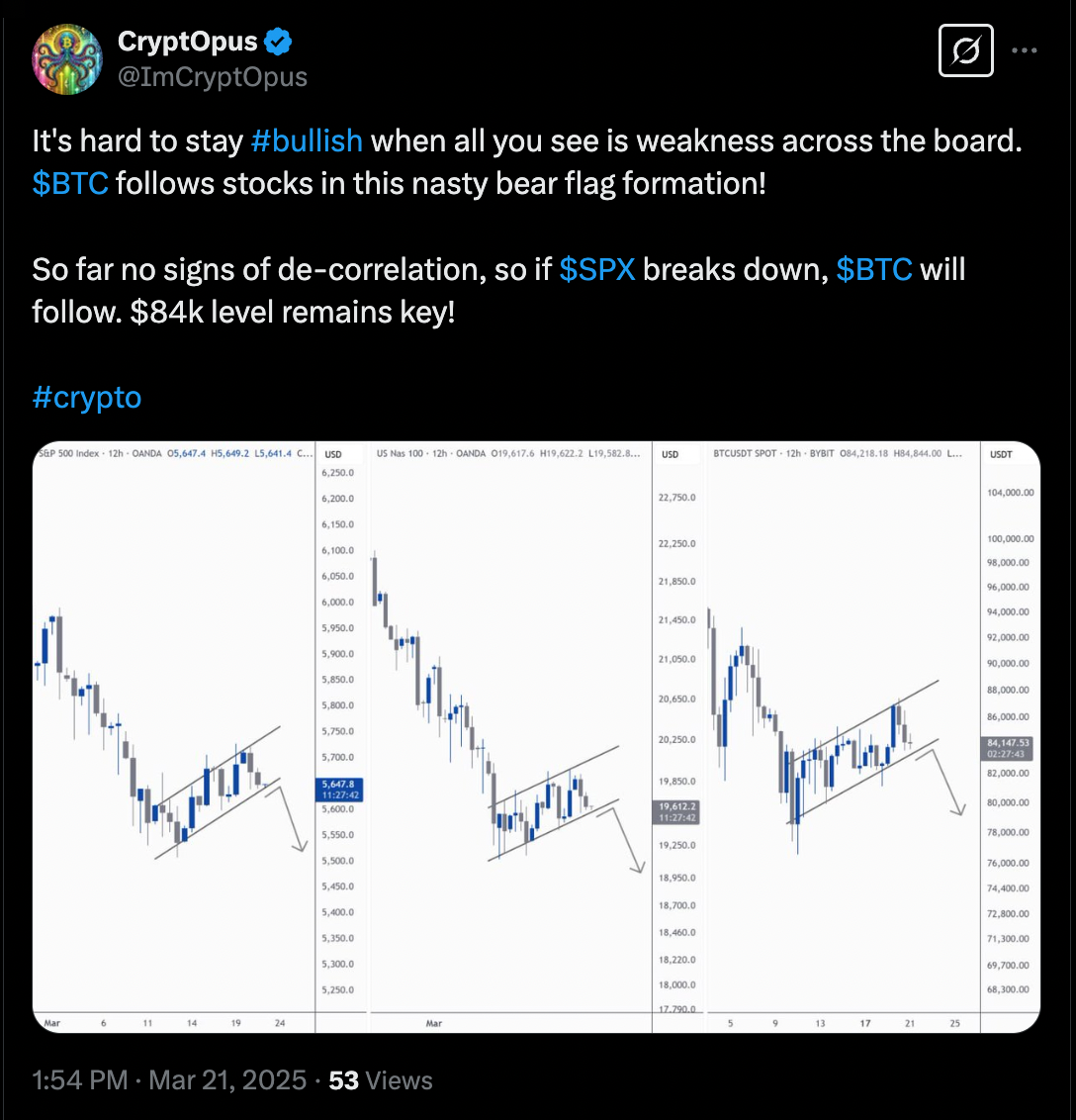Laut Analysten KryptopusBitcoin bleibt eng mit den traditionellen Aktienmärkten, insbesondere dem S & P 500 (SPX) und NASDAQ 100 (NDX), korreliert, die beide Bärenflaggenmuster in den Diagrammen anzeigen.