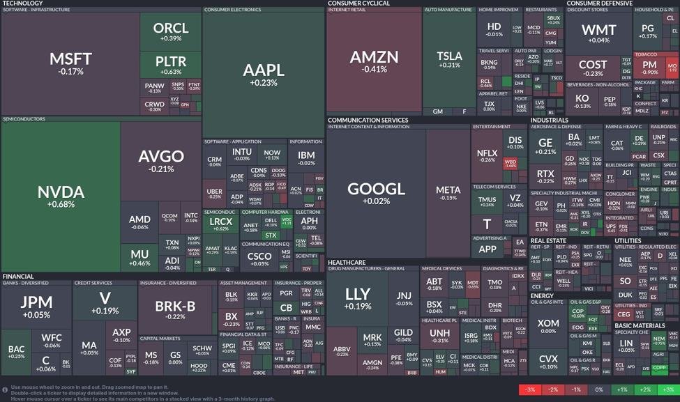 - Technologiesektor: Der Technologiesektor ist vielversprechend NVDA Führende Zuwächse von 0,68 %, was die positive Anlegerstimmung unterstreicht. ORCL Und PLTR weisen ebenfalls leichte Zuwächse von 0,39 % bzw. 0,63 % auf, was die anhaltende Stärke der Software-Infrastruktur widerspiegelt.