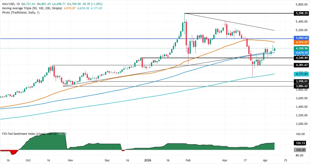 Technische XAU-Analyse: Die Erholung des Goldes stagniert bei 4.800 $, da die Bären den 20-Tage-SMA im Auge behalten