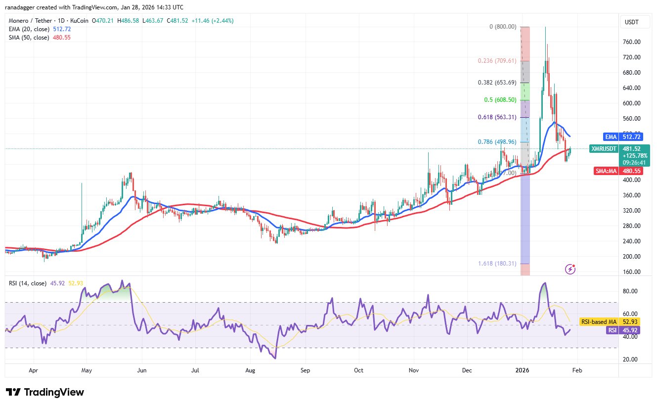 Moneros (XMR) Der Rückzug stößt beim 50-Tage-SMA (480 USD) auf Widerstand, was darauf hindeutet, dass die Bären bei kleineren Rallyes verkaufen.