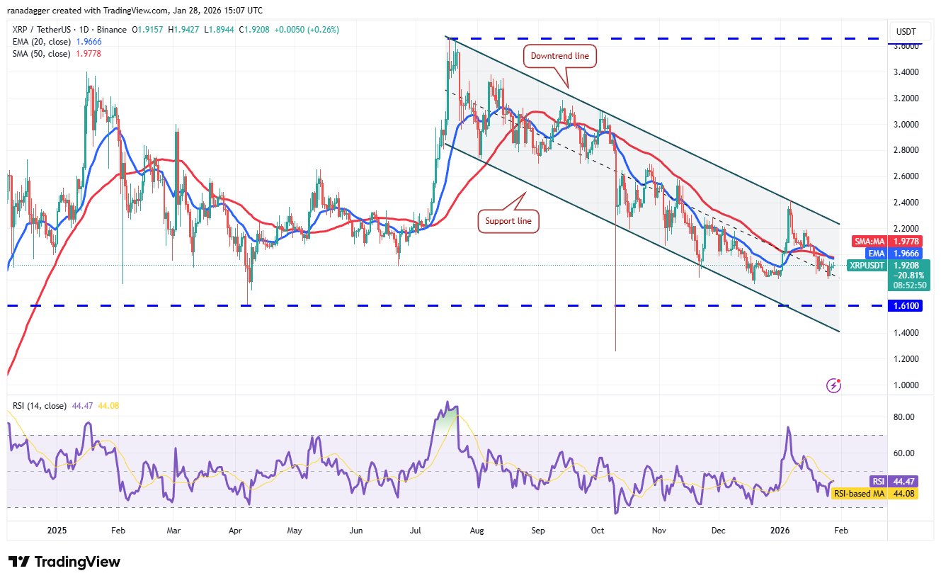Verkäufer werden versuchen, den XRP-Preis unter die 1,77-Dollar-Marke zu drücken. Wenn es ihnen gelingt, könnte das XRP/USDT-Paar bis zur wichtigen Unterstützung bei 1,61 US-Dollar sinken. Von Käufern wird erwartet, dass sie die Zone zwischen der Unterstützungslinie des absteigenden Kanalmusters und der 1,61-Dollar-Marke energisch verteidigen.