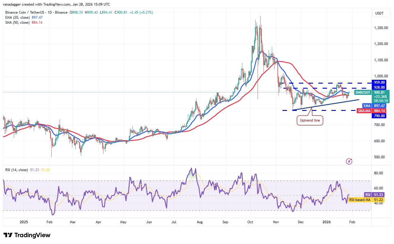 BNB (BNB) versucht, über den exponentiellen gleitenden 20-Tage-Durchschnitt (897 USD) zu steigen, was auf ein niedrigeres Nachfrageniveau hindeutet.