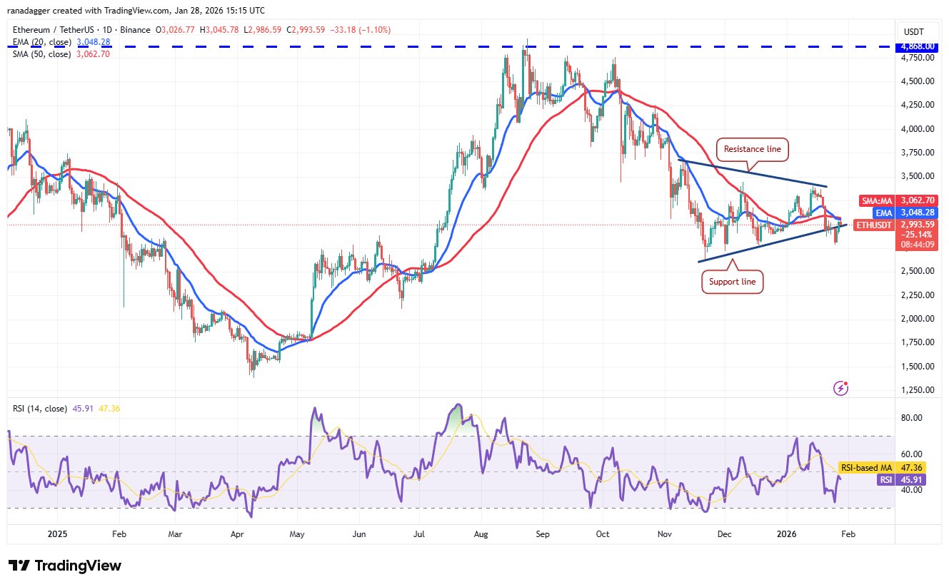 Äther (ETH) ist am Dienstag wieder in das symmetrische Dreiecksmuster eingetreten, aber die Erholung stößt bei den gleitenden Durchschnitten auf Widerstand.