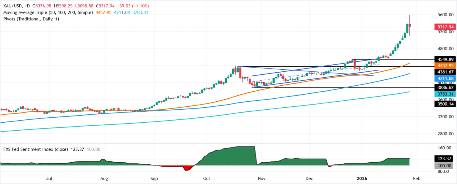 Wenn XAU/USD über 5.300 US-Dollar bleibt, könnte es im Bereich von 5.300 bis 5.400 US-Dollar seitwärts handeln. Ein Durchbruch an der Spitze der Spanne würde 5.500 US-Dollar und das Rekordhoch von 5.598 US-Dollar freilegen. Umgekehrt, wenn Gold Wenn der Kurs unter 5.300 US-Dollar fällt, könnte dies einen Rückgang in Richtung 5.200 US-Dollar und darunter verstärken.