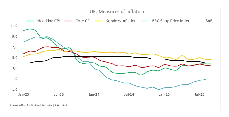 Neue Daten des Office for National Statistics zeigten, dass die VPI-Gesamtinflation im September auf 3,8 % stieg, während die Kerninflation (ohne Nahrungsmittel und Energie) leicht auf 3,5 % zurückging. Die Inflation im Dienstleistungssektor, die von der BoE oft genau beobachtet wird, blieb hartnäckig bei 4,7 %, was darauf hindeutet, dass der zugrunde liegende Preisdruck nicht vollständig nachgelassen hat.