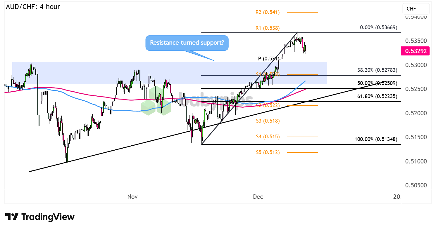 Der Pivotpunkt (.5310) liegt in der Nähe und könnte bei einer flachen Korrektur mehr Käufer anziehen, während S1 (.5280) mit dem 38,2 %-Fibonacci-Retracement-Level und früheren Widerstand übereinstimmt.