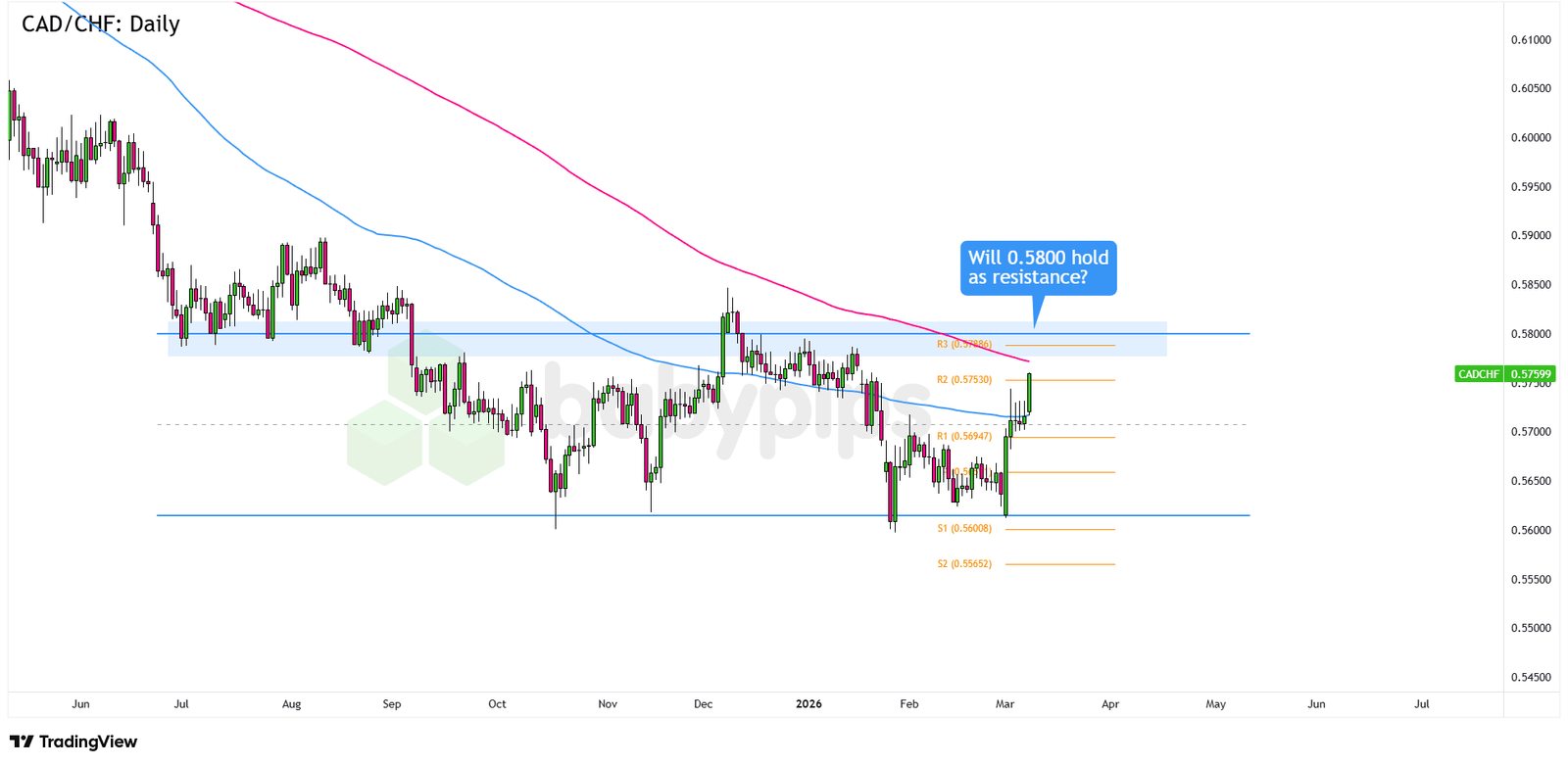 CAD/CHF, das sich zu Beginn des Monats von der Bereichsunterstützung von .5600 erholte, wird jetzt näher an .5770 gehandelt, deutlich über der mittleren Bereichszone von .5700 und der Pivot-Point-Linie R2 (.5753).