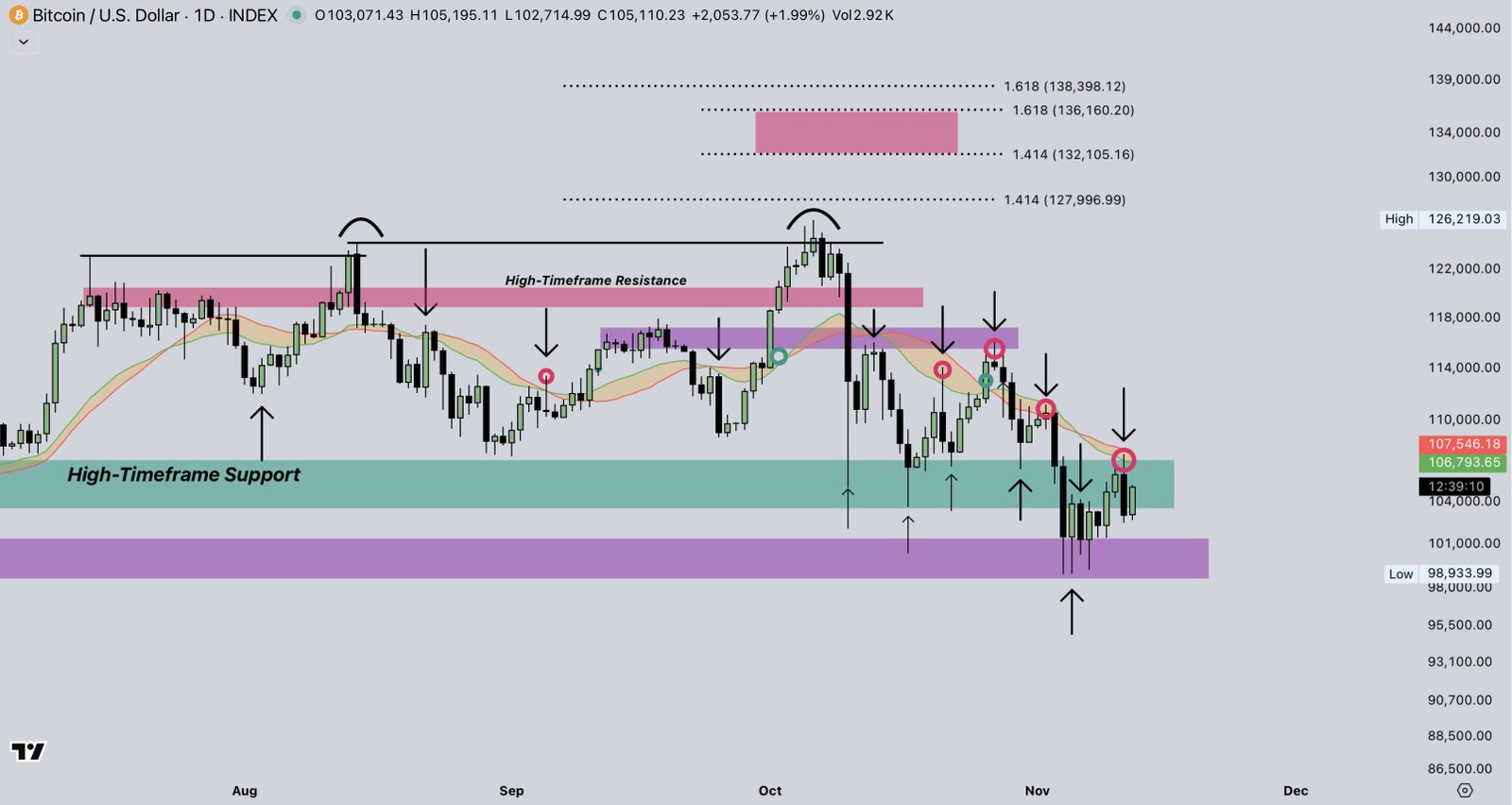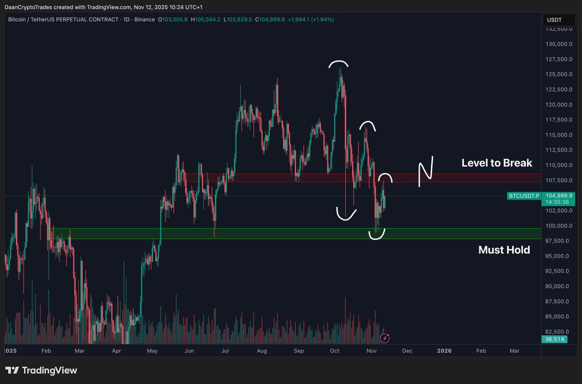 „Auf dem unteren Zeitrahmen tendiert es nach oben. Aber es muss den Bereich von 107.000 US-Dollar durchbrechen. Wenn das gelingt, würde es daraus eine ordentliche Abweichung machen und wieder in den Bereich zurückkehren“, schrieb der Händler Daan Crypto Trades in einem Antwort auf X.