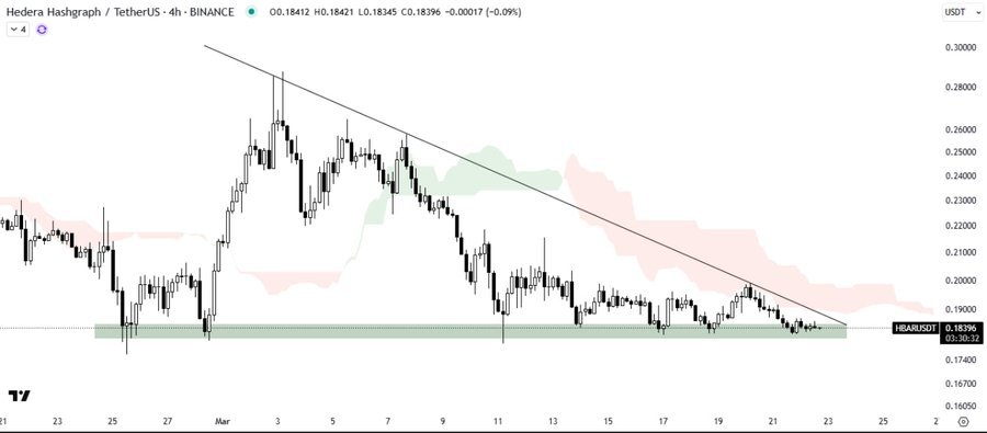 Der Markt schien auf die Bestätigung von Hedera in der Schlüsselunterstützungszone von 0,18 USD zu warten. Eine Trendumkehr ist möglich, wenn die Münze über ihrer absteigenden Trendlinie bricht und den Ichimoku -Wolkenwiderstand überwindet.