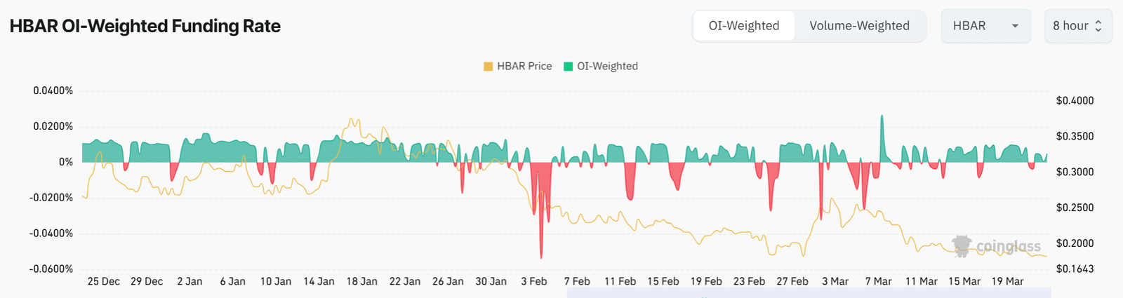 Die 24-Stunden-offene Zinsen von HBAR sind um 4,5% gestiegen, da die Finanzierungsrate für offene Zinsen (OI) in den letzten 48 Stunden bis zum Pressezeit positiv geworden ist.
