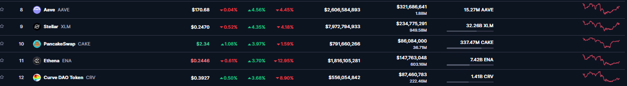 Ein weiteres Trendthema auf dem heutigen Kryptomarkt waren die DeFi-Protokollmünzen. Aave-Protokoll [AAVE], PancakeSwap [CAKE], Athene [ENA]Und Kurven-DAO [CRV] füllte diesen Sektor, da einige in den Top 10 erschienen.