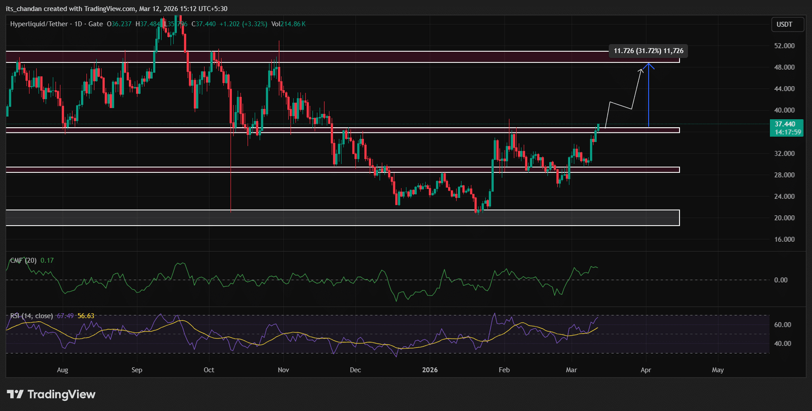 Basierend auf der aktuellen Preisentwicklung könnte der Vermögenswert einen weiteren Preisanstieg von 30 % erleben und möglicherweise in den kommenden Tagen die Marke von 48 US-Dollar erreichen, wenn die Aufwärtsdynamik von HYPE anhält und eine Tageskerze über 37 US-Dollar schließt.