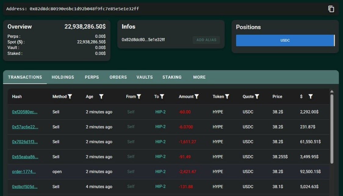 Die bemerkenswerteste Transaktion kam von einem bekannten Whale-Wallet, High Stakes Capital, das seine HYPE-Bestände vollständig liquidierte.