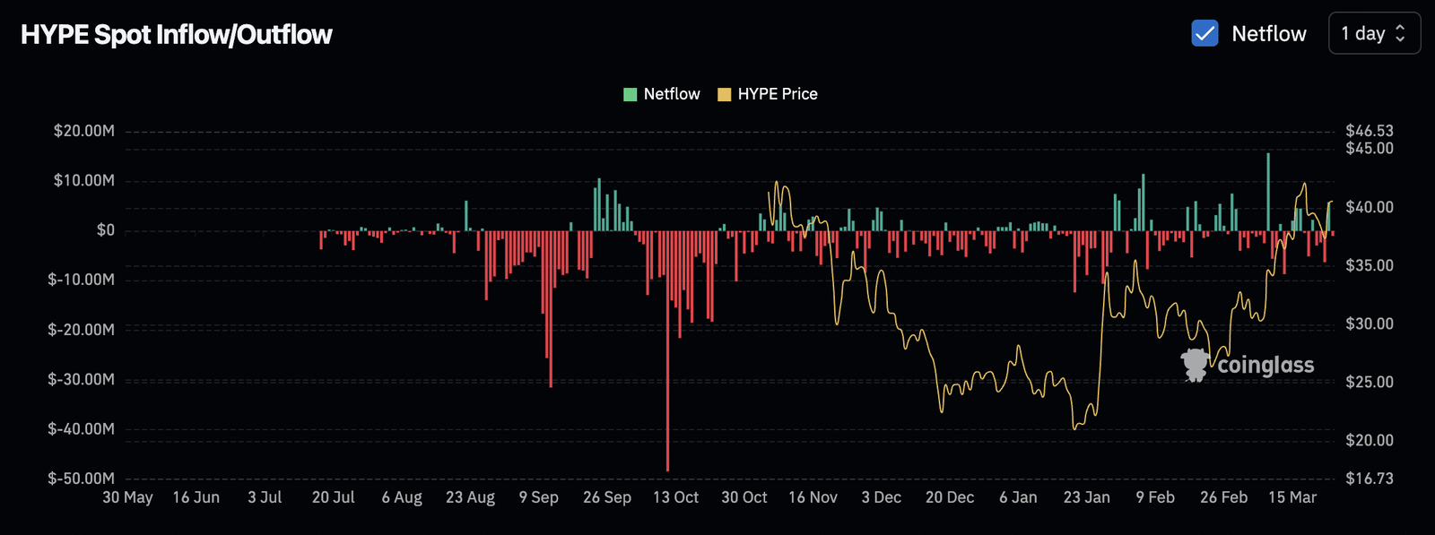 Die Nettozuflüsse blieben negativ, was bedeutet, dass mehr HYPE die Börsen verließen als eintraten. Dieses Muster signalisiert normalerweise eine Akkumulation.