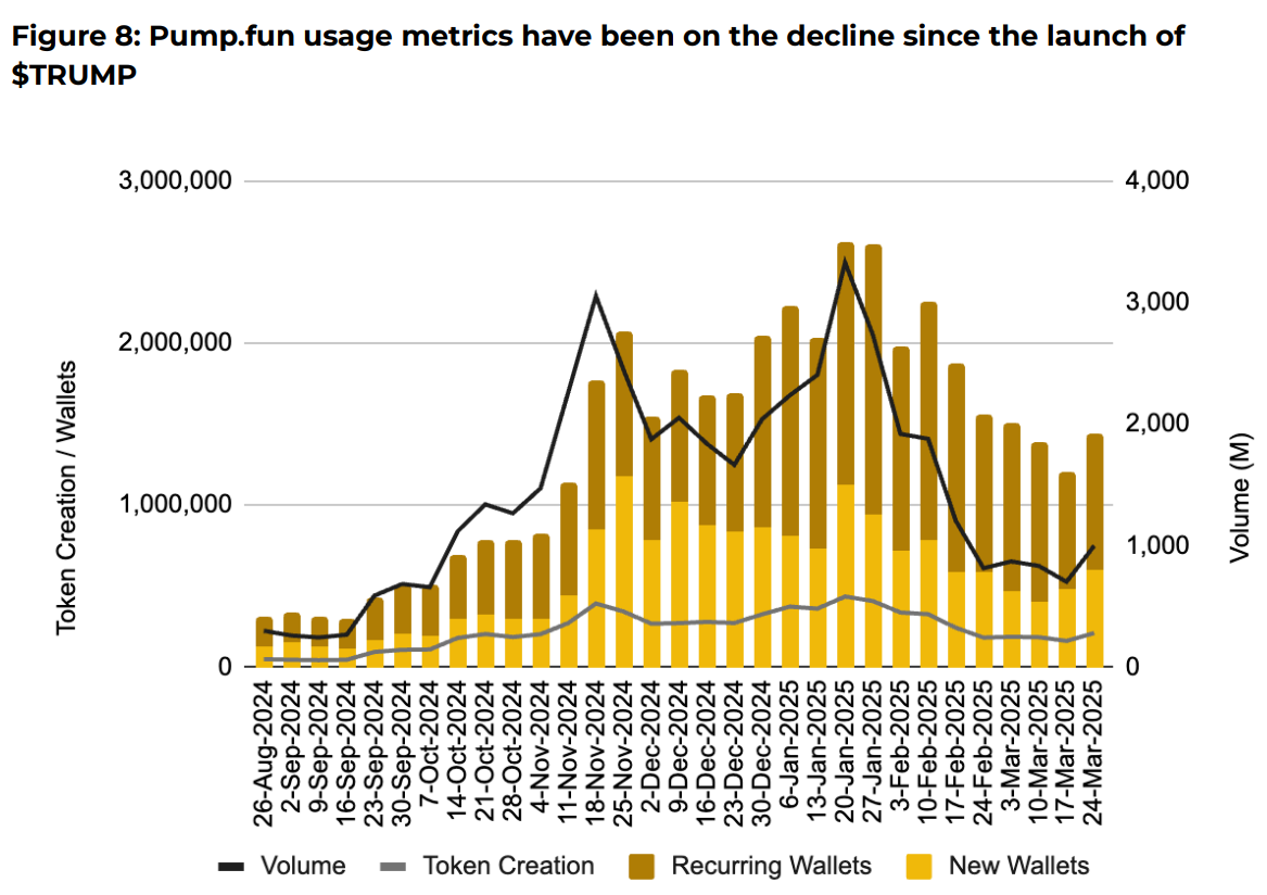 Die wöchentlichen Nutzungsmetriken des Memecoin Launchpad erreichten die Woche von Trumps Amtseinführung und sind seitdem zurückgegangen. Total Active -Word auf Pumpe.Fun fiel von 2,85 Millionen in der Woche des 20. Januar auf nur 1,44 Millionen zum 31. März.