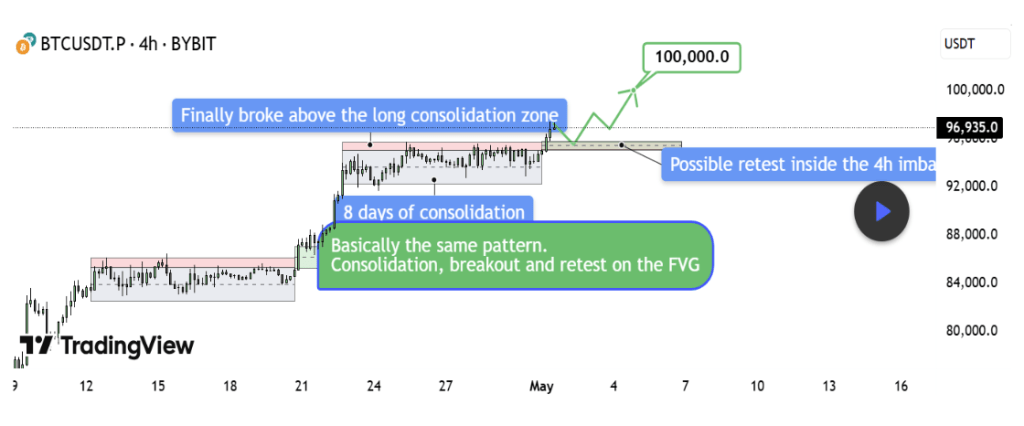 Hinzu kommt der Bullish -Fall, Krypto -Analyst Tehhthomas teilte eine überzeugende Technische Analyse, die auf einen Ausbruch hinwies Fortsetzung von 100.000 US -Dollar. Die Interpretation des 4-Stunden-Zeitrahmens von BTCUSDT zeigt eine fast identische Struktur für die Mitte April.