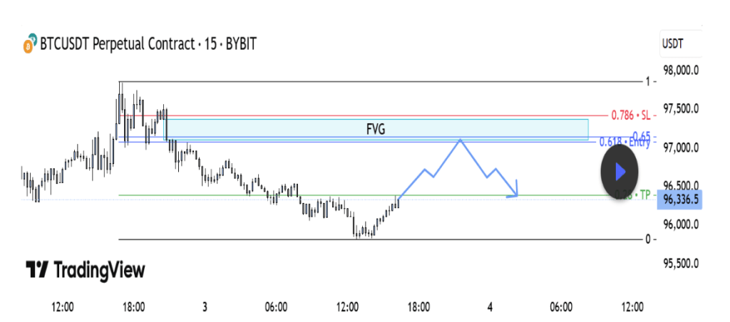 Nicht alle Analysten sind überzeugt Dieser Bitcoin wird ohne zuerst ohne Shakeout 100.000 US -Dollar erreichen. Eine Gegenansicht auf Die TradingView-Plattform beleuchtet ein mögliches kurzfristiges Bearish-Setup, das auf dem 15-minütigen BTCUSDT-Diagramm basiert.
