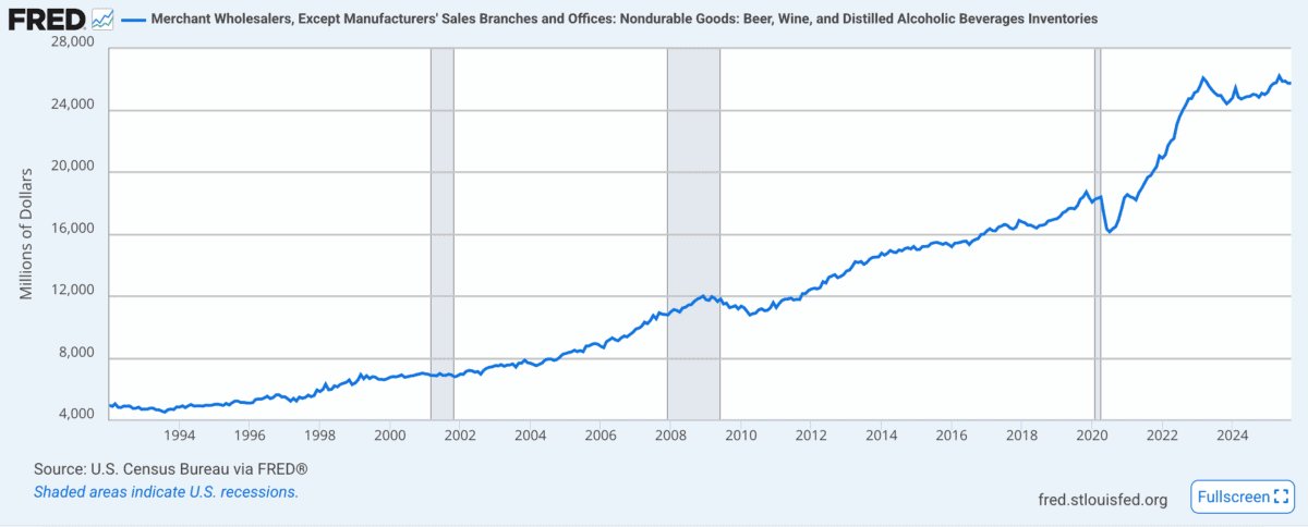 Eines der größten Probleme für Diageo war die jüngste schwache Nachfrage in Schlüsselmärkten wie den USA. Und es gibt Gründe zu der Annahme, dass dies auch im Jahr 2026 so bleiben könnte. In den USA verkaufen Alkoholhersteller an Großhändler und nicht direkt an Einzelhändler. Daher können die Lagerbestände von Großhändlern ein nützlicher Datenpunkt für Anleger sein.