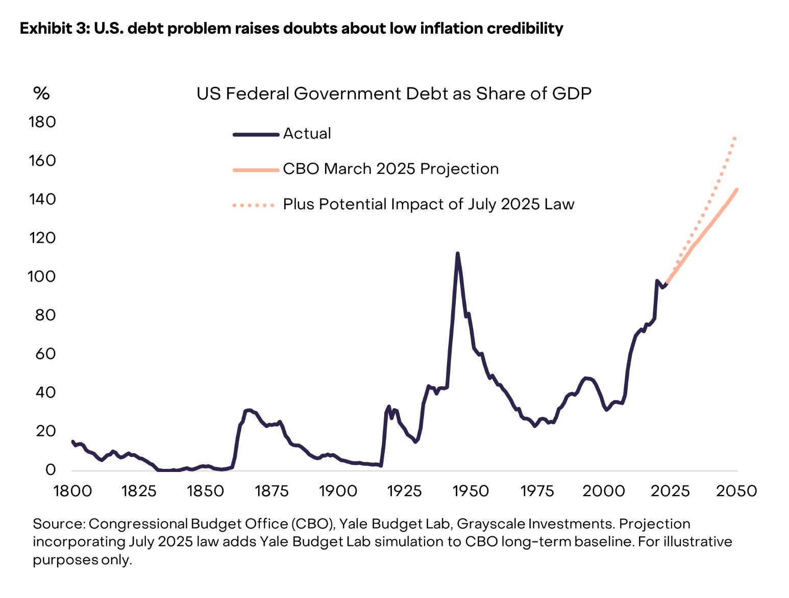 „Fiat-Währungen (und auf Fiat-Währungen lautende Vermögenswerte) sind aufgrund der hohen und steigenden Verschuldung des öffentlichen Sektors und ihrer möglichen Auswirkungen auf die Inflation im Laufe der Zeit zusätzlichen Risiken ausgesetzt“, schrieb Grayscale in seinem neuester Berichtund fügte hinzu: