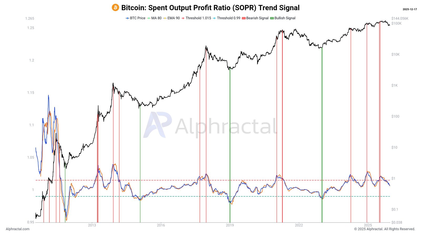 João Wedson, Gründer des On-Chain-Analyseunternehmens Alphractal, spitz zum Trendsignal der Spent Output Profit Ratio (SOPR), einer Kennzahl, die das Ende des Bitcoin-Bullenmarktes signalisiert.