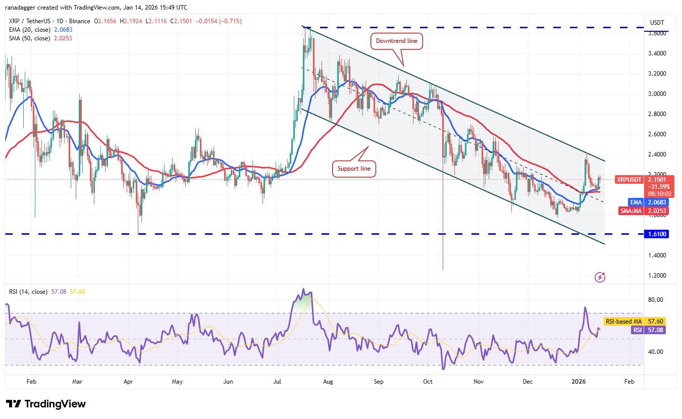 Der steigende 20-Tage-EMA (2,06 $) und der RSI im positiven Bereich deuten darauf hin, dass die Bullen die Oberhand haben. Dadurch erhöht sich die Wahrscheinlichkeit eines Durchbruchs über die Abwärtstrendlinie, was auf eine mögliche Trendwende hindeutet. Das XRP/USDT-Paar könnte dann auf 2,70 $ steigen.