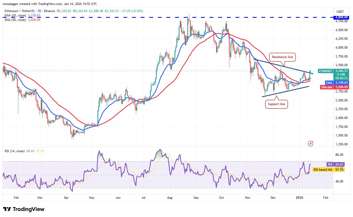 Die Bären werden versuchen, den Preis wieder in das Dreieck zu ziehen, aber wenn die Bullen die Widerstandslinie erfolgreich verteidigen, könnte das ETH/USDT-Paar auf 3.659 US-Dollar und dann auf 4.000 US-Dollar steigen.