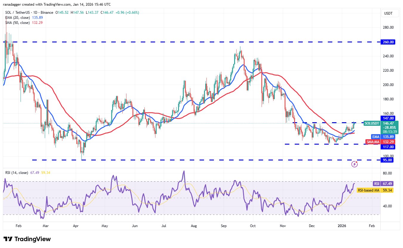 Der steigende 20-Tage-EMA (135 USD) und der RSI in der Nähe der überkauften Zone deuten darauf hin, dass der Weg des geringsten Widerstands nach oben führt. Wenn Käufer die 147-Dollar-Marke überwinden, könnte das SOL/USDT-Paar an Dynamik gewinnen und in Richtung 172 Dollar steigen.