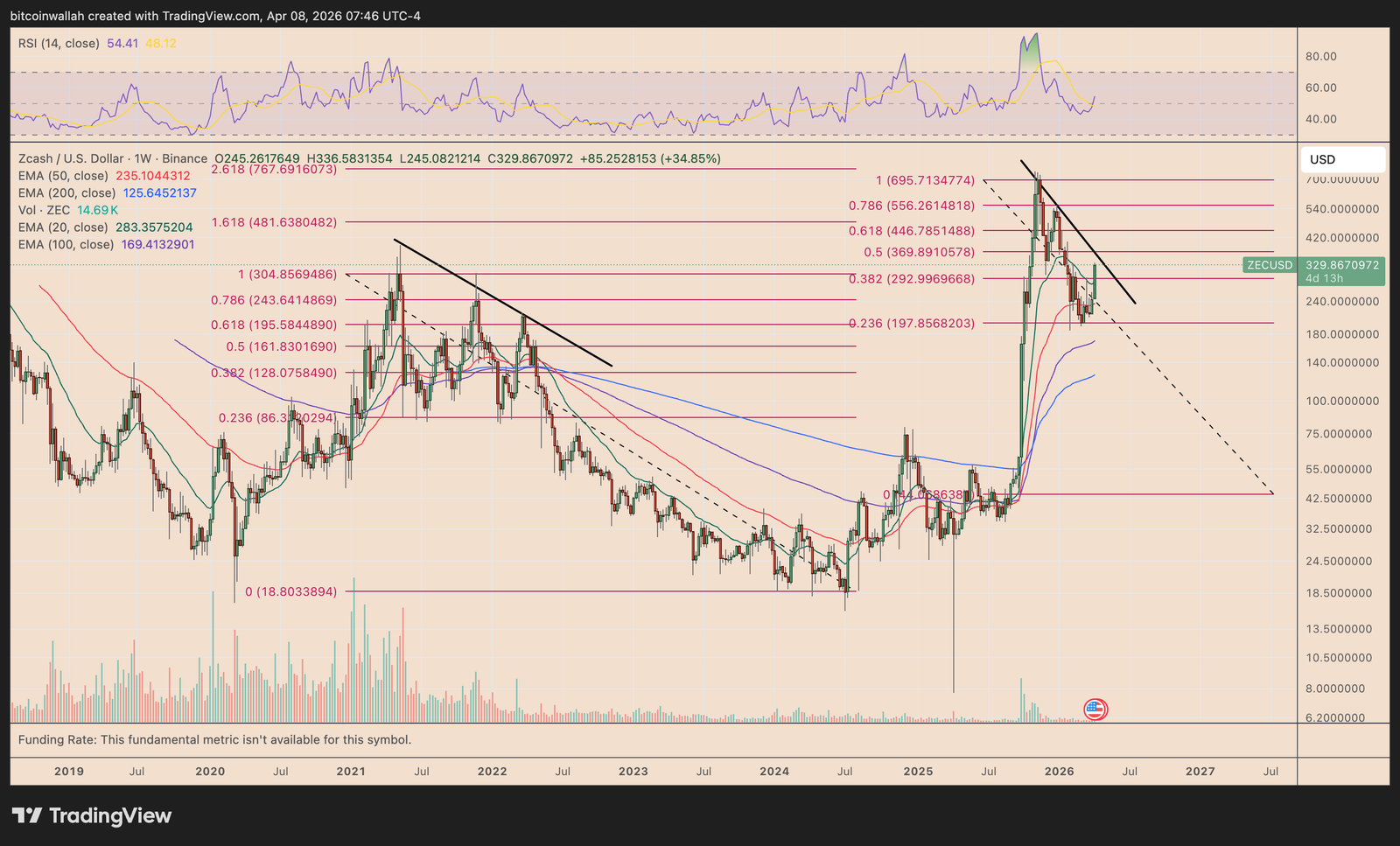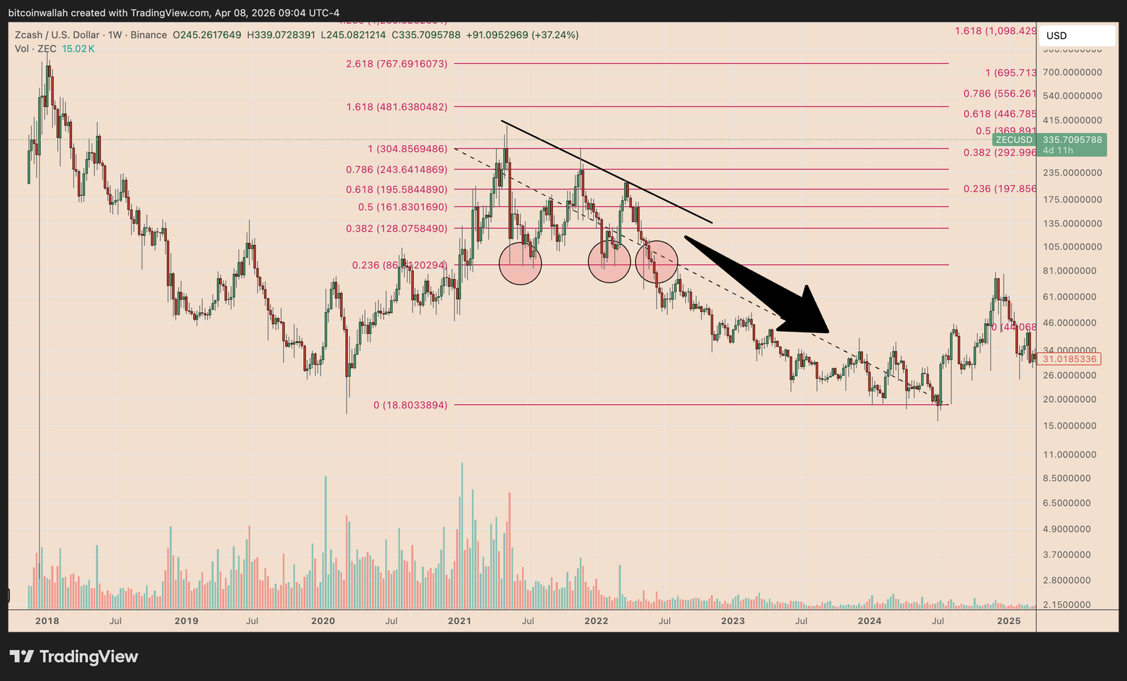 Die jüngste Erholung von ZEC ähnelt allmählich der Konstellation nach ihrem Höhepunkt im Jahr 2021. Damals trat er in einen längeren Abwärtszyklus ein, nachdem er seinen Höchststand bei 392 US-Dollar erreichte.