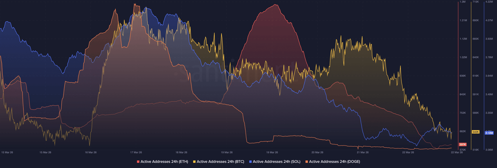 Darüber hinaus in großen Netzwerken wie Ethereum [ETH]Solana [SOL]und Dogecoin [DOGE]Die Aktivitätsniveaus waren entweder flach oder rückläufig. Ethereum Etwa um den 19. März kam es zu einem plötzlichen Anstieg der aktiven Nutzer, der jedoch nicht lange anhielt. Dies deutete darauf hin, dass es möglicherweise auf kurzfristige Ereignisse zurückzuführen war.