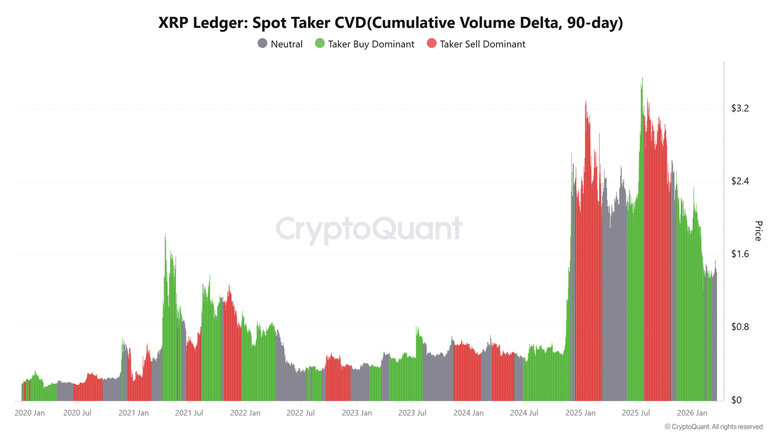 Der Spot Taker CVD von XRP zeigt nach einer starken Akkumulationsphase bis Ende 2024 eine Abkühlung der Dynamik. Als die Kaufdominanz früher zunahm, trieben aggressive Marktaufträge den Preis in Richtung 3,0–3,2 US-Dollar, was eine klare Richtungsüberzeugung widerspiegelt.