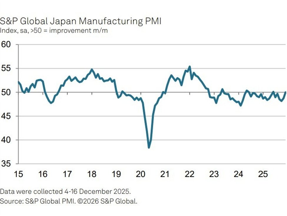 Japans Fertigungssektor zeigte Ende 2025 deutliche Anzeichen einer Stabilisierung, wobei sich die Geschäftsbedingungen laut den neuesten Umfragedaten von S&P Global auf den besten Stand seit mehr als einem Jahr verbesserten. Während die Nachfrage insgesamt gedämpft blieb, verlangsamte sich das Tempo des Rückgangs der Neuaufträge deutlich, die Produktion stabilisierte sich und die Beschäftigung nahm weiter zu, was auf eine zaghafte Dynamik für das Jahr 2026 hindeutet.