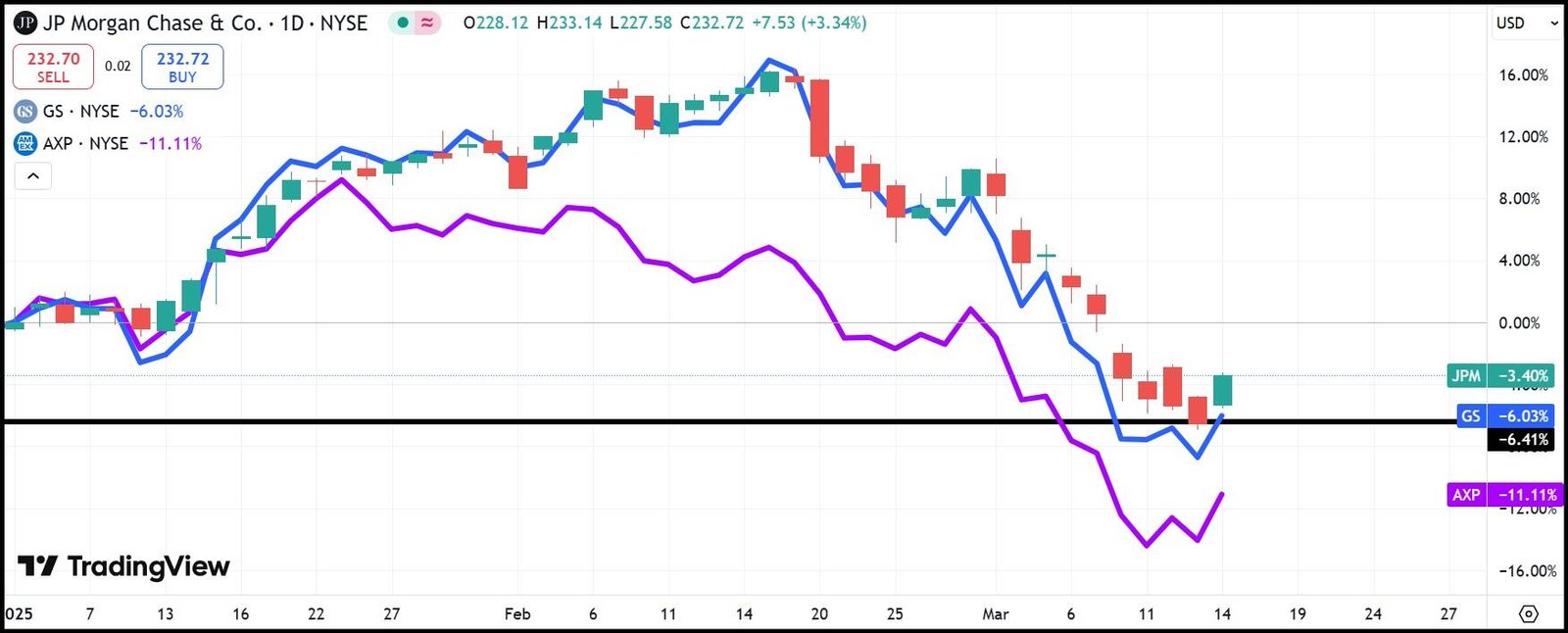 JPM, GS, AXP-Aktienleistung von Jahr zu Jahr
