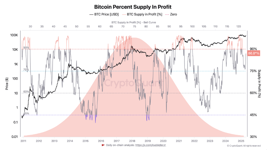 Der starke Prozentsatz von Profitable Bitcoin Holdings ist während einer kürzlich veröffentlichten Marktwiederherstellung nach Daten des Analyseunternehmens Cryptoquant. Der technische Experte Darkfost stellt fest, dass Bitcoin -Angebot im Gewinn über 90%im Allgemeinen die letzte Phase eines Bullenmarktes darstellt.