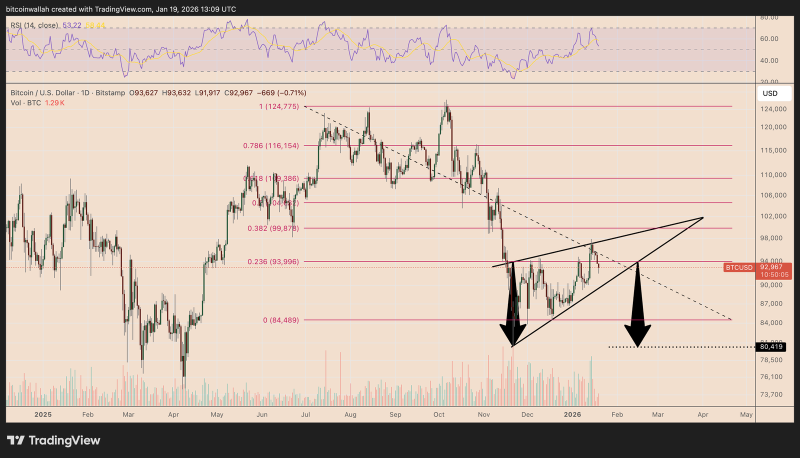 $80,000 downside risk grows if Bitcoin breaks down from its rising-wedge pattern.