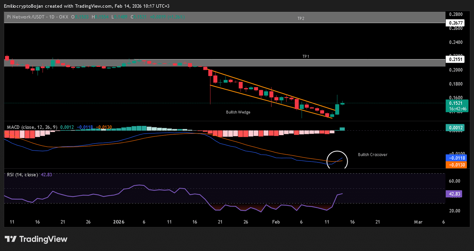 PI hatte einen brutalen Einbruch von 96 % gegenüber seinem Allzeithoch erlebt. Daher erforderte jeder strukturelle Ausbruch Respekt. Am 14. Februar 2026 bewegte sich der Preis deutlich über ein anhaltendes bullisches Keilmuster hinaus.