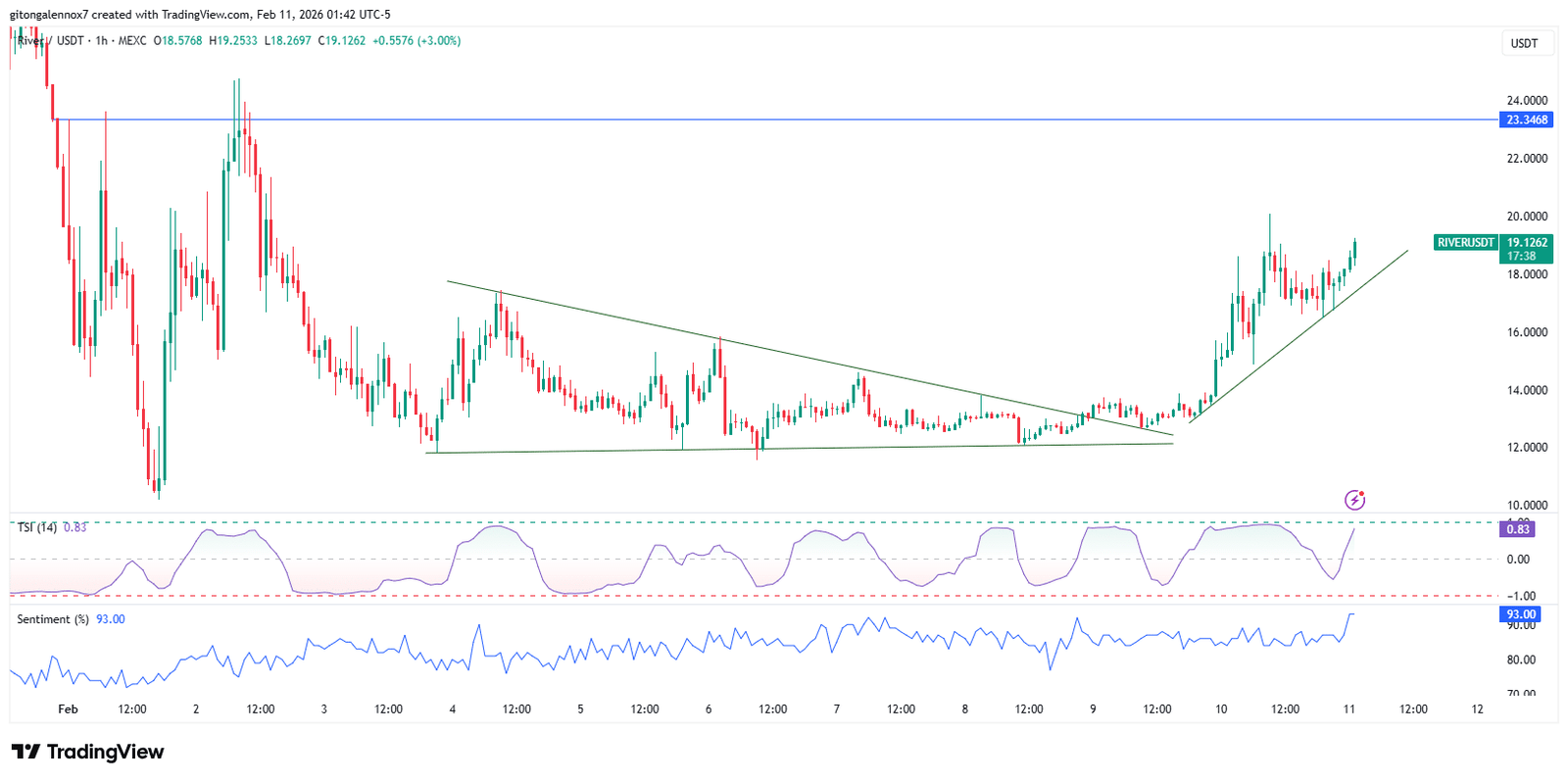 Seitdem bewegt sich RIVER in Richtung 23 US-Dollar, während es von der aufsteigenden Trendlinienunterstützung abprallt. Dies zeigte sich am Trend Strength Index (TSI) von 0,86, der nur noch wenige Punkte vom Erreichen des Höchstwertes entfernt war.