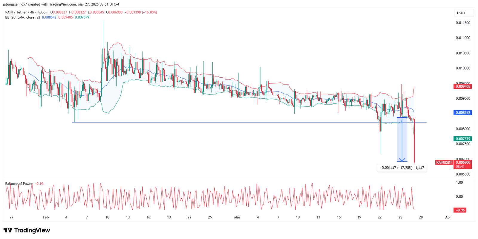 Während der Gesamtmarkt um rund 3 % zurückging, sank RAIN zweistellig. Der Altcoin fiel im ersten Quartal 2026 um 9,5 %, nachdem er im dritten und vierten Quartal 2025 gestiegen war.