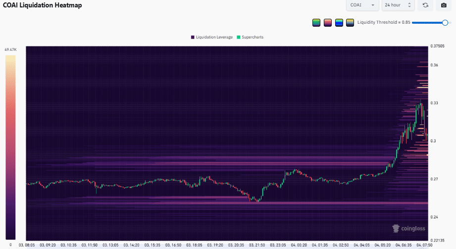 In den letzten 24 Stunden konnte COAI jedoch aus dieser Seitwärtsbewegung ausbrechen und ein Tageshoch von 0,3331 US-Dollar erreichen. Seitdem ist der Markt in einen Pullback eingetreten, der den erneuten Testbereich zu bestätigen scheint.