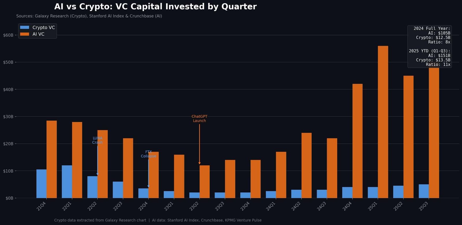 Venture Capital (VC) unterstützt diese Transfers seit 2021. KI-Narrative liegen in Bezug auf das von VCs investierte Kapital vor Krypto pro Miles Deutscher.