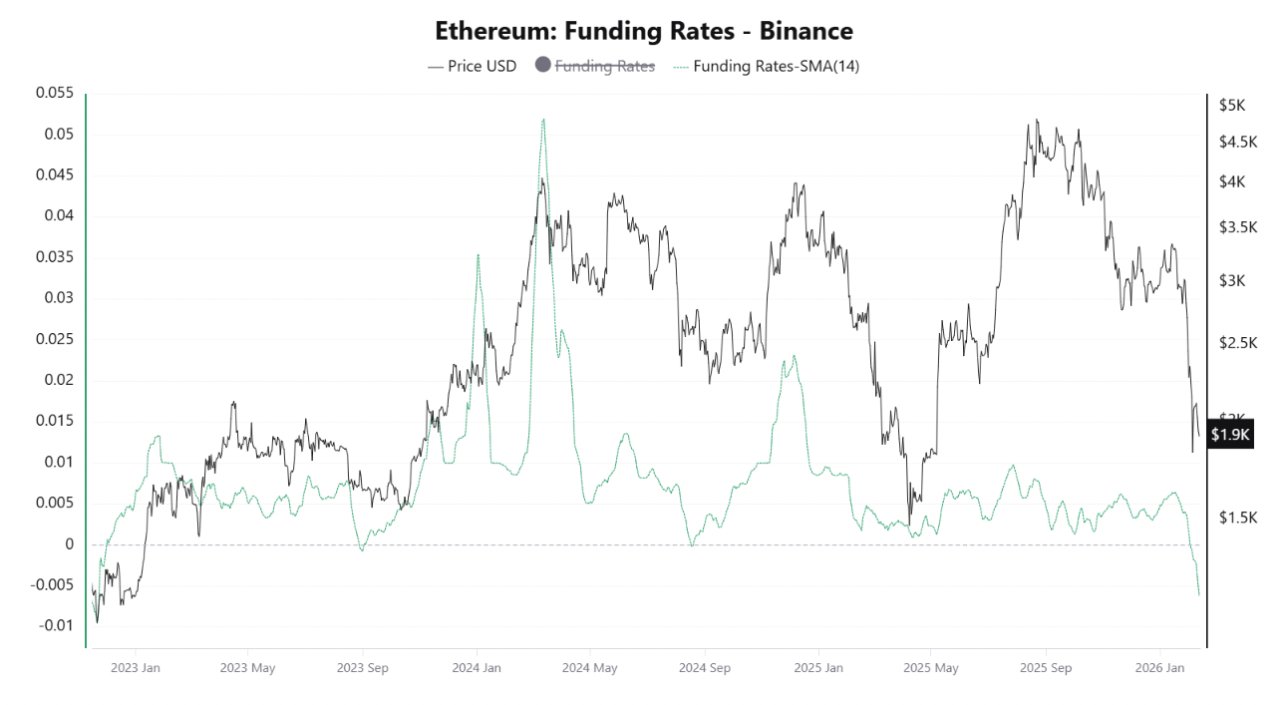 Die Finanzierungszinsen für Ether-Futures auf Binance sind mit -0,006 tief in den negativen Bereich abgestürzt und markieren den niedrigsten Wert seit Anfang Dezember 2022.