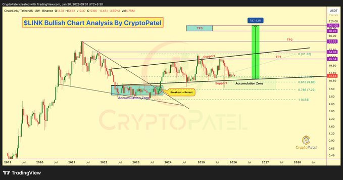 Ein Analyst identifizierte eine entscheidende Unterstützungszone für LINKwas darauf hindeutet, dass die Münze das Potenzial für eine 1000-prozentige Bewegung hatte. Da sich LINK über dem Fibonacci-Niveau von 0,618 (9,88 US-Dollar) hält, prognostizierte der Analyst Kursziele von 31 US-Dollar, 52 US-Dollar und 100 US-Dollar.