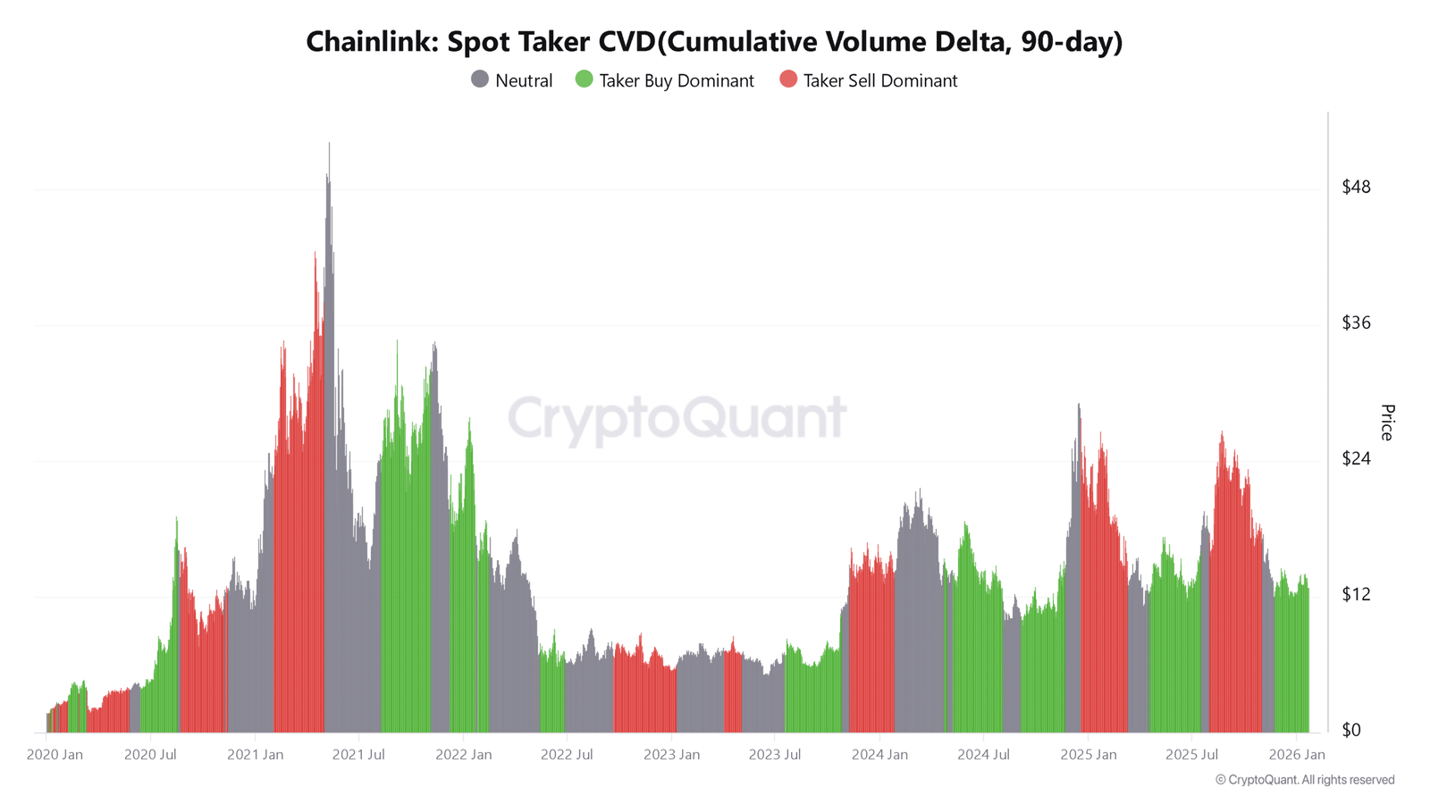 Seit Juli 2025 wird LINK von Taker-Sell-Aktivitäten dominiert. Im Jahr 2026 kam es jedoch zu einer Verschiebung und die Dominanz von Taker Buy übernahm.