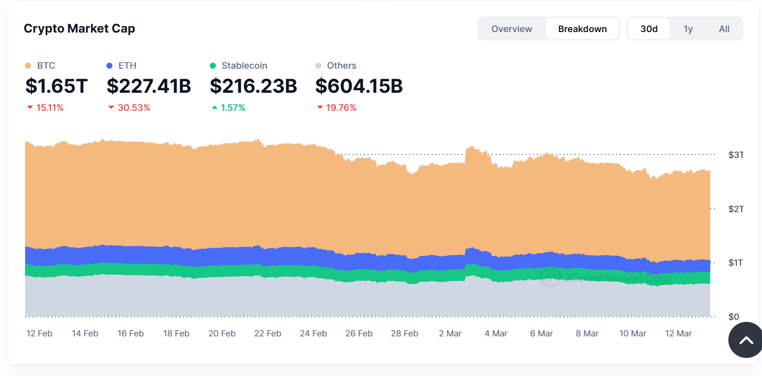 Die Marktkapitalisierung von Bitcoin betrug zum Zeitpunkt der Presse 1,65 Billionen US -Dollar und kennzeichnete einen Rückgang von 15,11%, während Ethereum einen drastischeren Rückgang verzeichnete und um 30,53% auf 227,41 Milliarden US -Dollar zurückging.