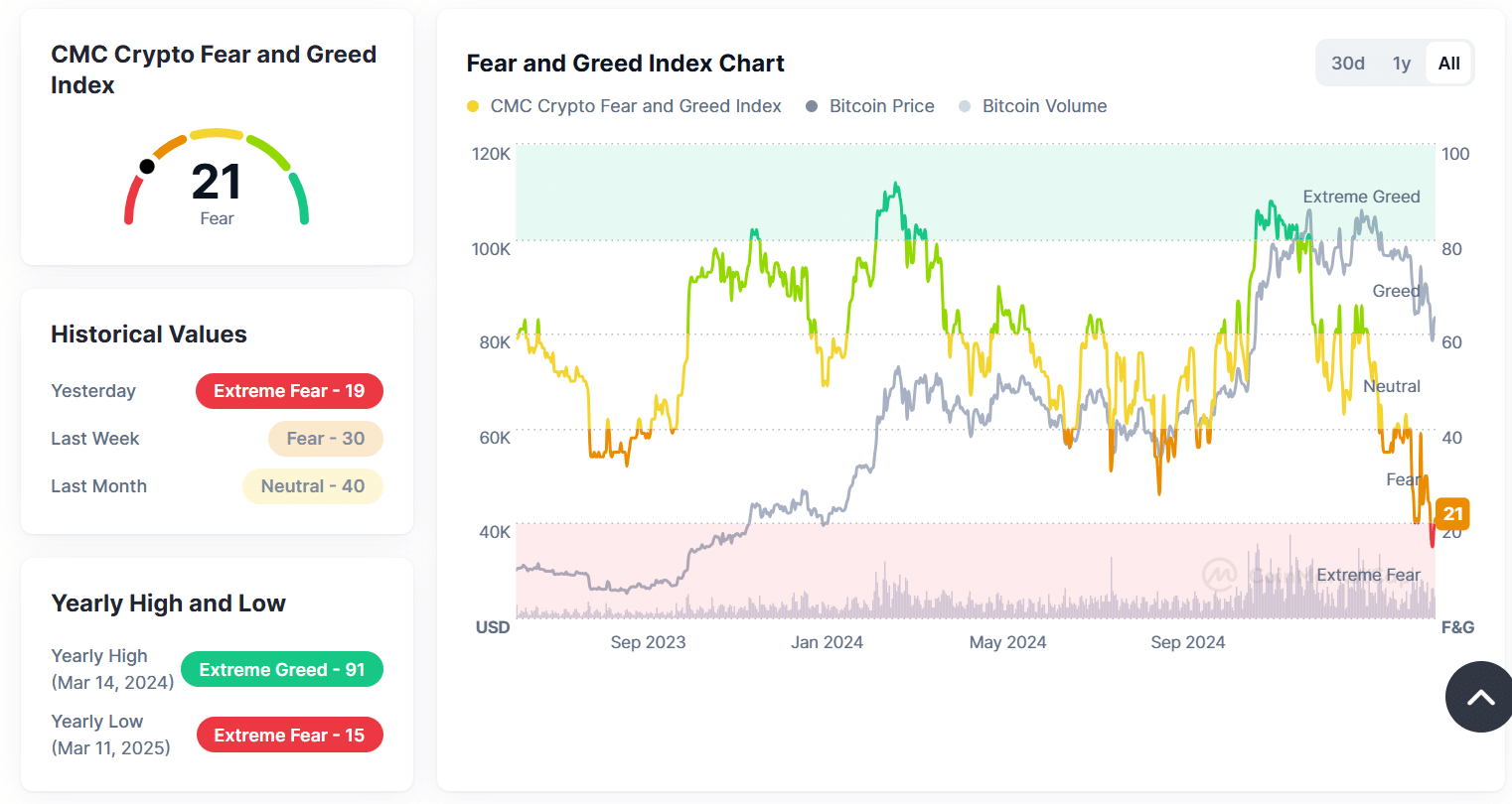 Die Krypto Marktgefühl hat einen bedeutenden Treffer erzielt, als der Index für Angst und Gier auf 21 gesunken ist, was auf extreme Angst unter den Anlegern hinweist.
