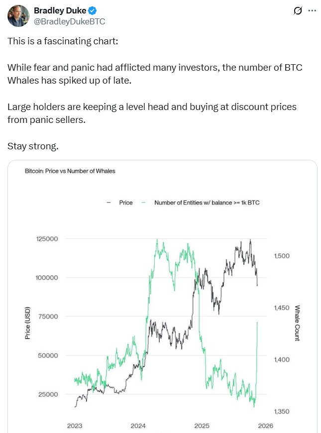Bradley Duke, Geschäftsführer und Leiter von Bitwise Asset Management in Europa, sagte in einem X-Beitrag am Mittwoch, dass sein Unternehmen das als bemerkt hat Angst und Panik im Griff Auf dem Markt haben Wale bei Kursrückgängen aufgekauft.