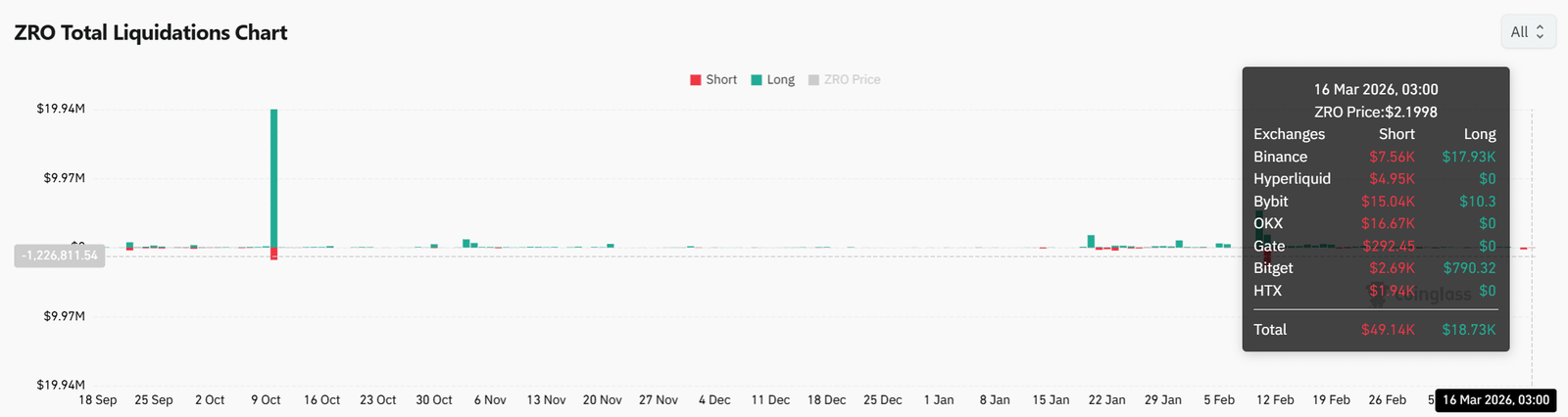 Auch die Derivatedaten spiegeln allmählich den erneuten Preisanstieg auf den LayerZero-Märkten wider. Das Gesamtliquidationsdiagramm zeigt Short-Positionen, die während der letzten Bewegung einen etwas höheren Druck absorbieren mussten.